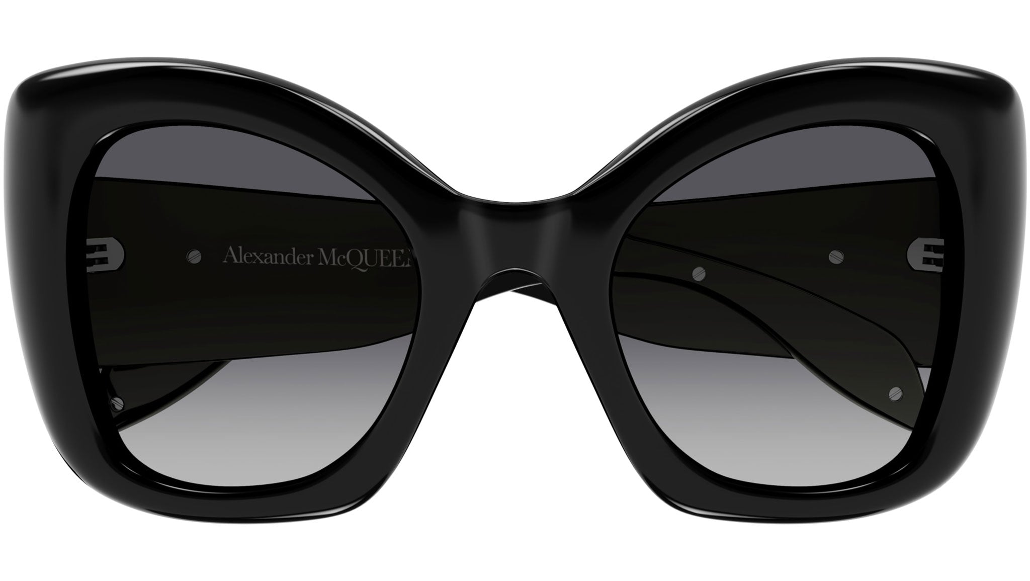 Occhiali da sole Alexander McQueen linea Icons modello AM0402S variante colore 001 nero lucido con lenti color grigio sfumato.