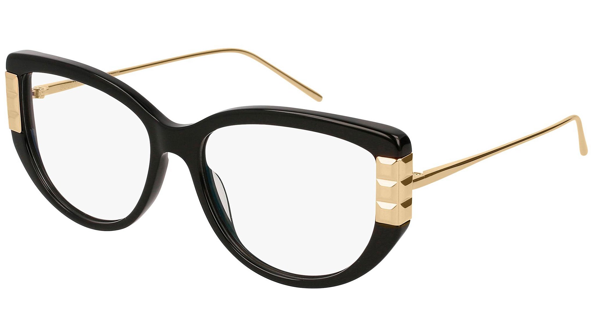 Occhiali da vista BC0051O 001 della collezione Boucheron Quatre con montatura nero lucido / oro lucido e astine color oro.